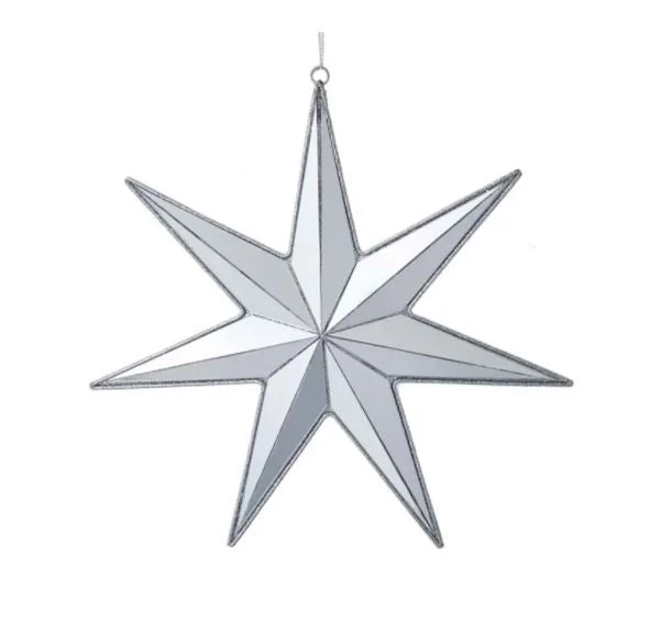 This mirrored star ornament is a festive addition to any holiday décor or Christmas tree. Each 7-point star is decorated with glitter for a shimmering effect.