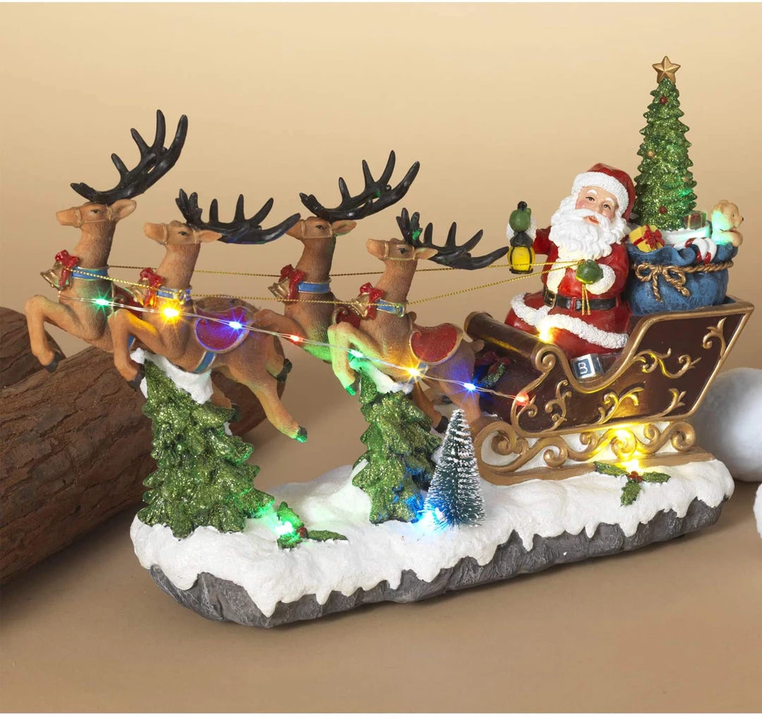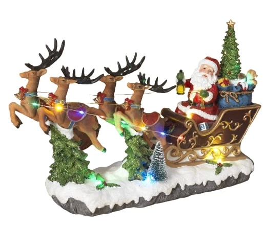 Bring a classic touch of Christmas to your home with this light-up musical Santa, sleigh, and reindeer tabletop decoration. This vintage lighted holiday decor features a Santa Claus figurine getting ready to fly his ornate sleigh full of Christmas presents into the sky, his reindeer already lifting off the snowy ground. The musical santa decoration plays classic holiday music and colorful LED lights on Santa’s reins will look beautiful as they illuminate your mantle, end table, or desk at the office.