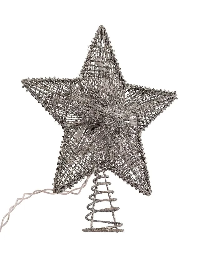 This 10-inch wire silver glitter star treetop is a fun and festive addition to your holiday décor. This treetop is made of silver glittery wires that come together into the shape of a star. Underneath the wire design are 10 miniature UL-listed lights, allowing the treetop to shine brightly and elegantly. Includes a 36-inch lead wire and clear bulbs.