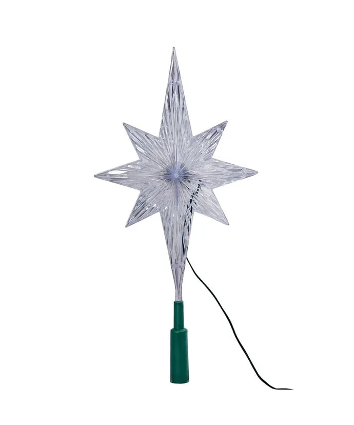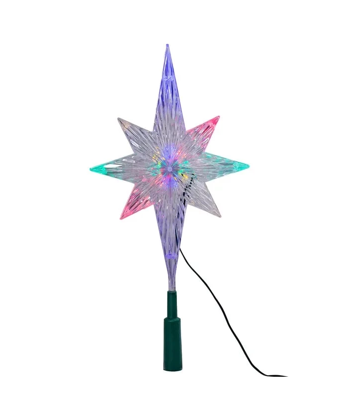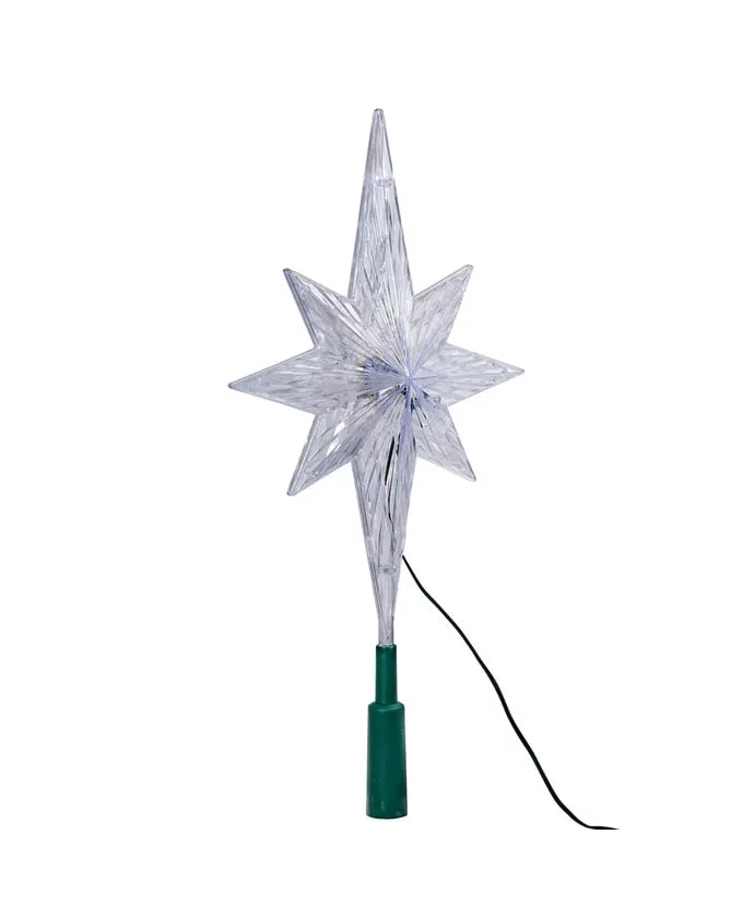 This 11.25-inch polar star treetop is a colorful, fun way to top your Christmas tree and accent its lighting. This 8-pointed star is color changing, changing from blue, to green to red.
