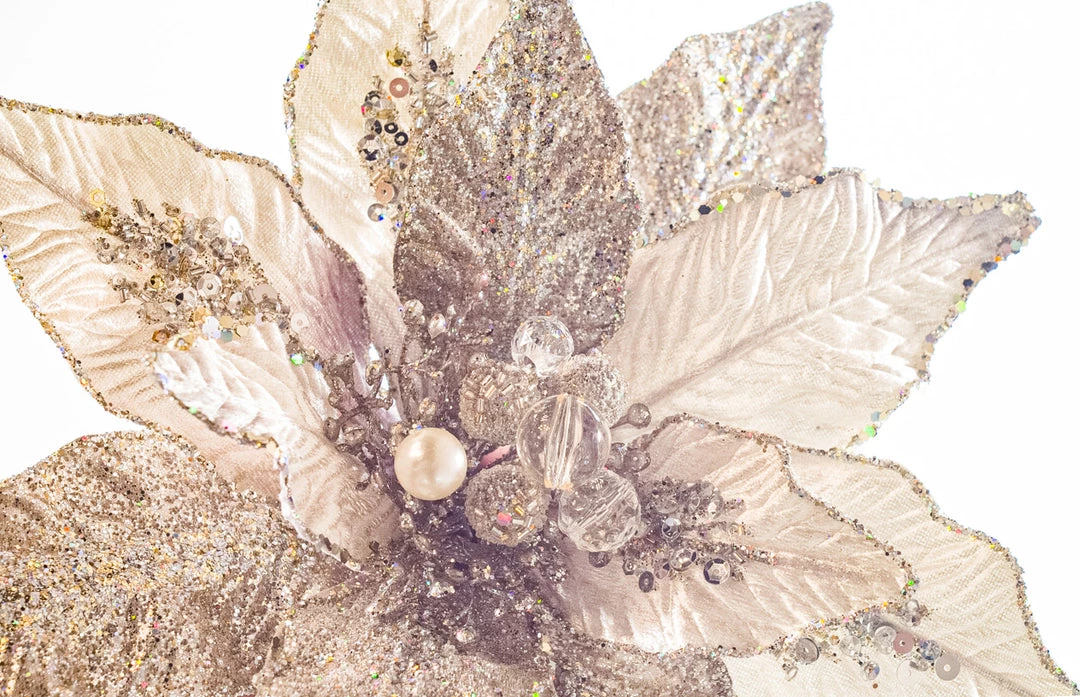 Celebrate a wonderful time with our platinum poinsettia pick! This platinum poinsettia features glitter & beaded accents and a gorgeous beaded center. The wire design allows this pick to be used for multiple holiday decorating needs, such as embellishing a garland, Tree, or adding some sparkle to a wrapped gift!