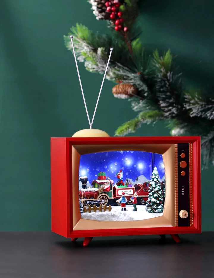 Santa and train in inside the TV. A detail had craft and painting through out the entire piece. Some kids are located in center of the TV to welcome Santa coming to the town. the cascading snowing revolving in the background on create a holiday scenery. A bright LED lighting are place every corner of the TV.