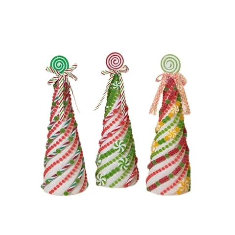 Add a fun touch to your seasons decor with these fun gumdrop candy cone trees. This set includes 3 of our cone trees all decorated with fun colors and candies! A perfect addition to any candy themed decor.
