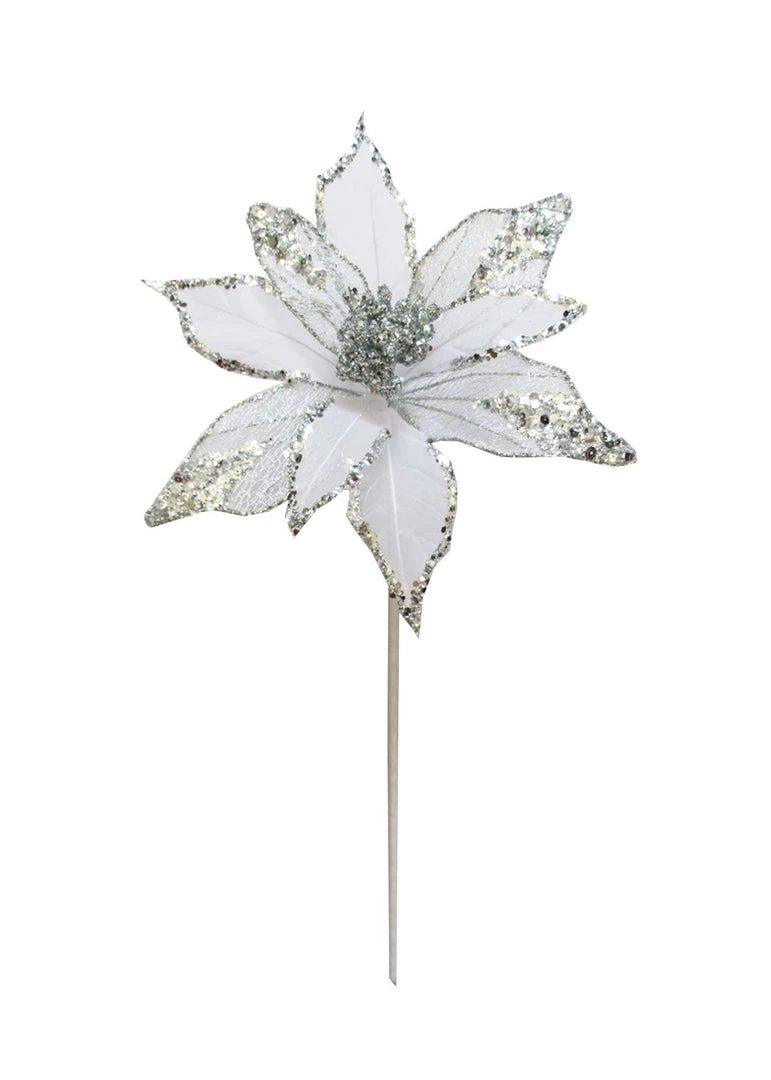 The Christmas Palace 16″ WHITE SHEER SILVER POINSETTIA SET OF 6