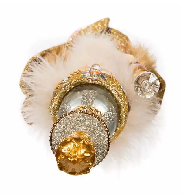 This 17.5-inch Gold King Nutcracker features a king in all gold with clear and amber gemstone accents. Each expertly crafted gold glittered king nutcracker has a matching staff in his hand and is standing on a glittered base with amber colored gemstone accents.