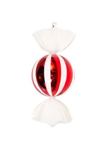 This adorable wrapped candy ornament combines the beauty and luster of glass with unbreakable practicality. With a shatterproof design, and featuring shiny red and white stripes, it looks good enough to eat! Coordinates perfectly with our Peppermint design theme.