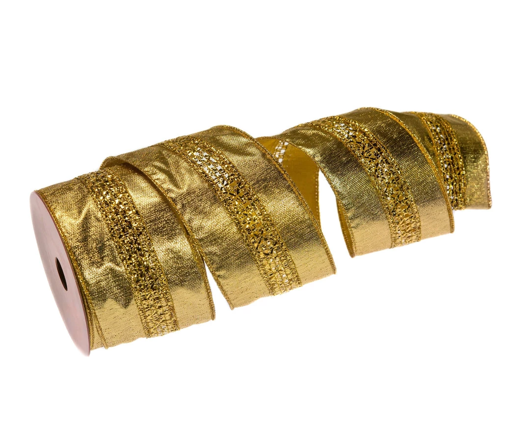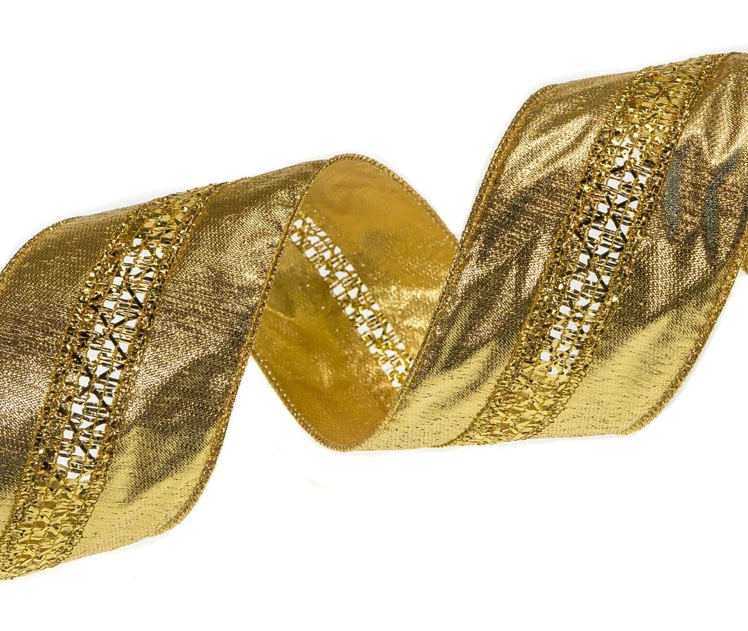 This wired ribbon features metallic bright gold fabric with a mesh patterned accent stripe, embroidered with shimmering gold thread, running down the center. Sewn wire edged ribbon allows you to bend and shape your creations to decorate with ease, making it perfect for decorating Christmas trees, wreaths, or gift accenting. Made in true designer quality, and crafted from the finest materials, this gorgeous ribbon is sure to bring festive elegance to your holiday decor!