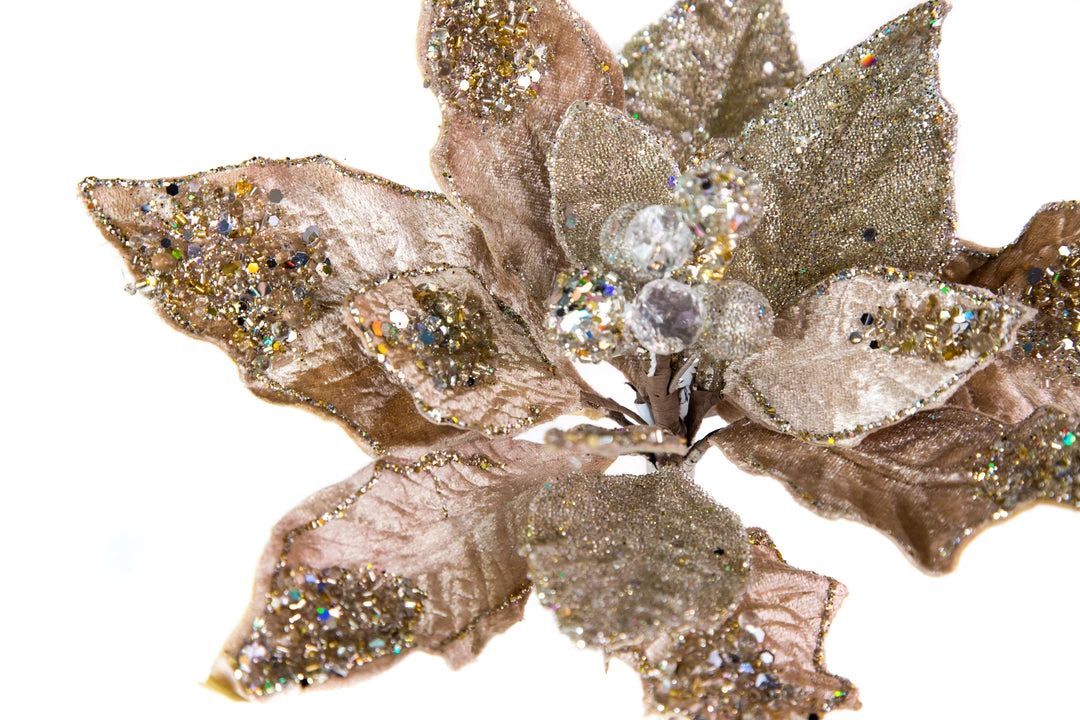 This Champagne and Platinum Poinsettia Pick is a decorator’s dream Christmas flower. Small and large, layering velour petals join to create a beautiful sparkling poinsettia bloom.