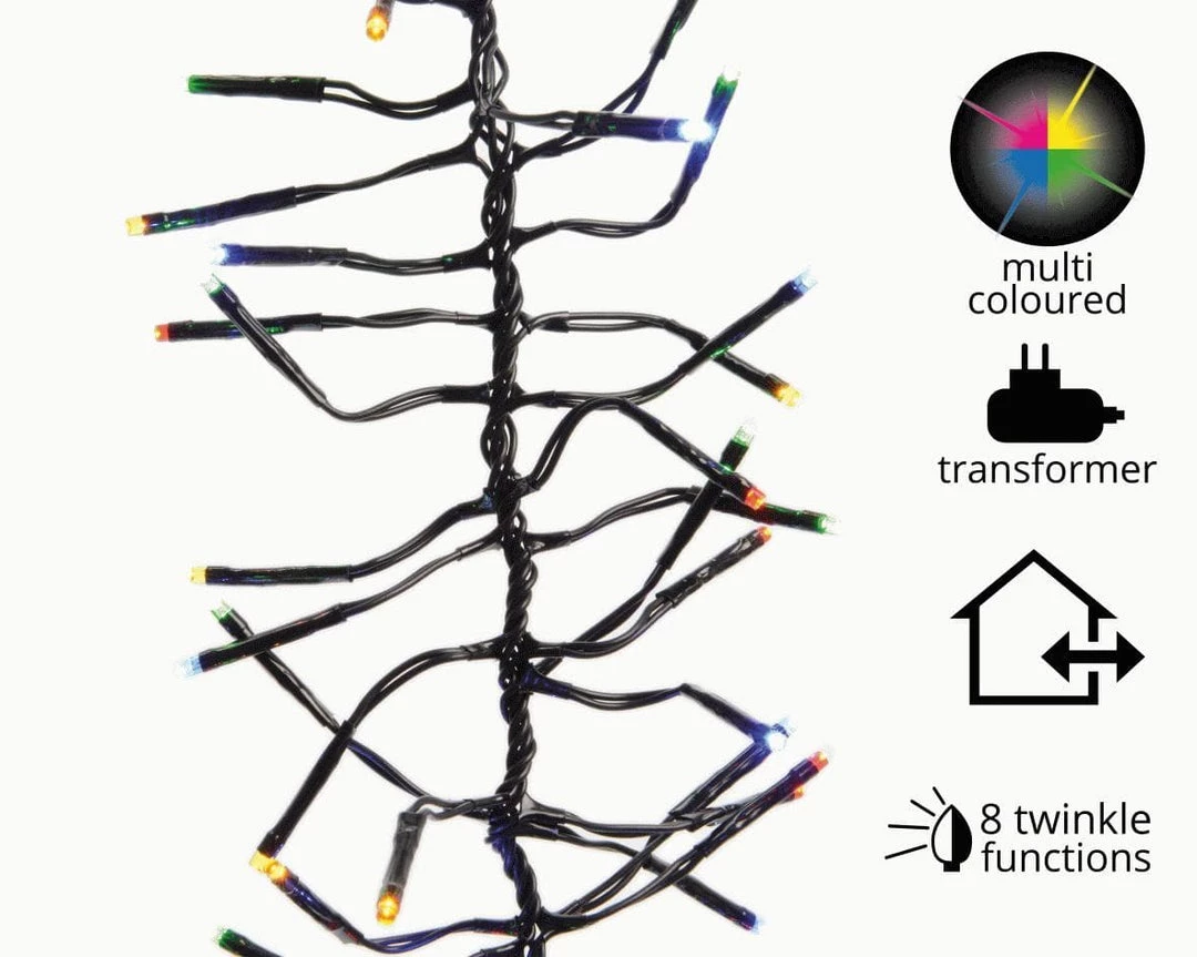Multicolored Cluster light string on green wire with 8 different twinkle functions featuring 768 LED lights.