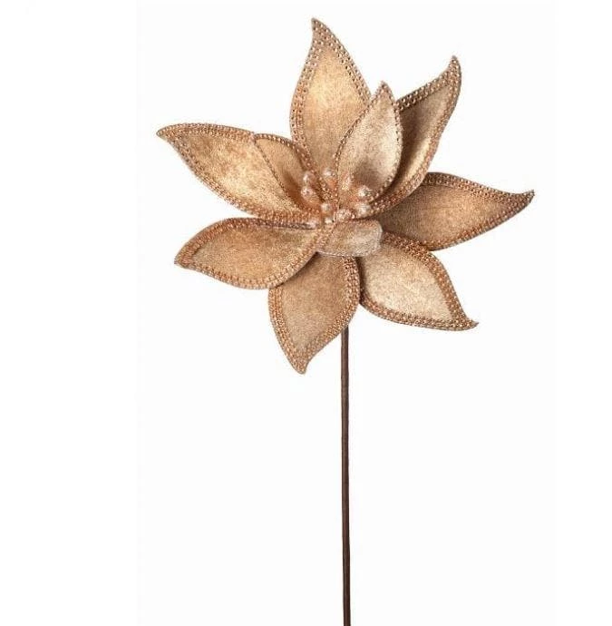 This beautiful and vibrant stem adds an elegant twist to the classic red Christmas poinsettia. The champagne velvety petals are lined with a stunning jeweled edge, brought together by a gold-toned center. This luxurious yet timeless flower is perfect to display in a vase, tree, wreath, or garland.