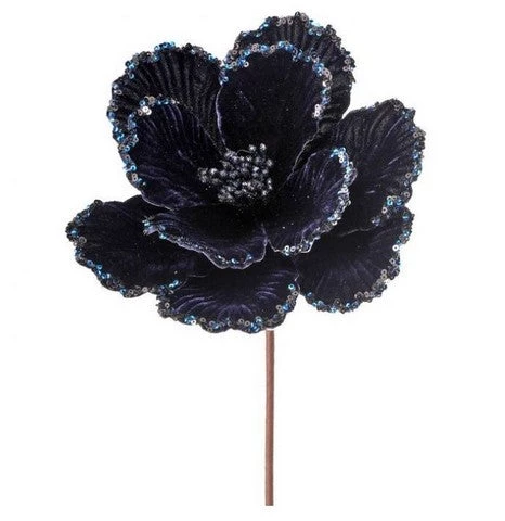 The Christmas Palace 24″ MIDNIGHT BLUE VELVET GLITTER BEADED EDGE MAGNOLIA STEM SET OF 6