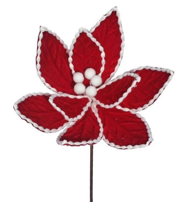The Christmas Palace 24″ RED & WHITE VELVET COTTON BEAD EDGE POINSETTIA STEM SET OF 12 Flowers