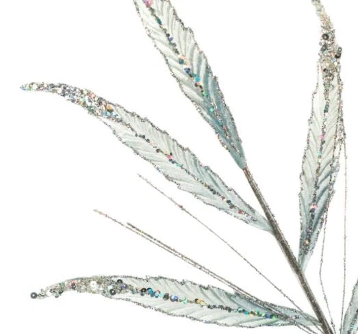 Add a unique texture to your elegant tree this year with this eye-catching leaf spray. The smooth tones of the glittery silver leaves extending out at different lengths are finished with touches of sequins.