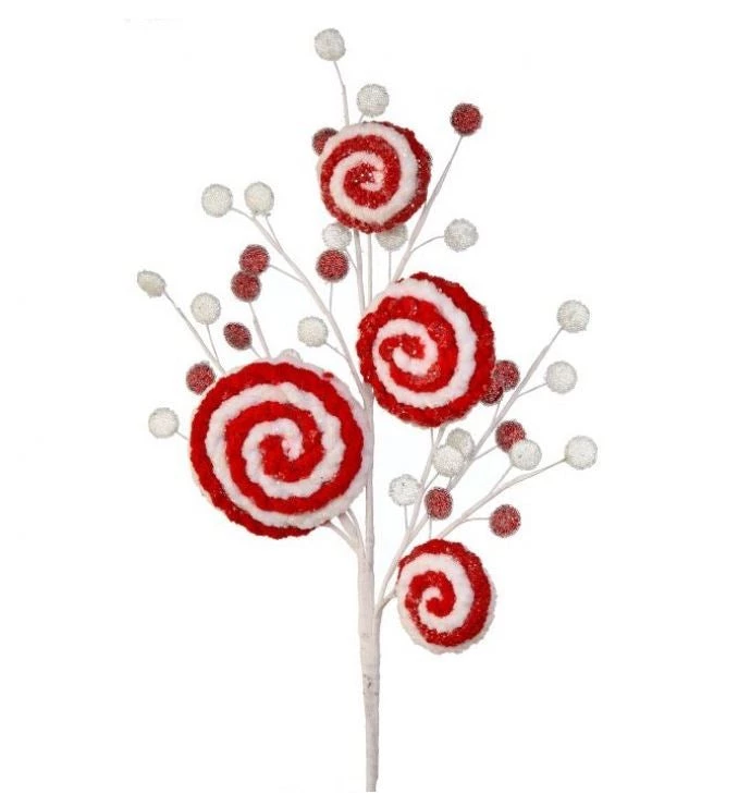 Add a touch of sweetness to your holiday decor this year with this spray of swirled red and white yarn-wrapped Lollipop, dusted with “sugar” glitter and accented with sprays of red and white sugared candy.