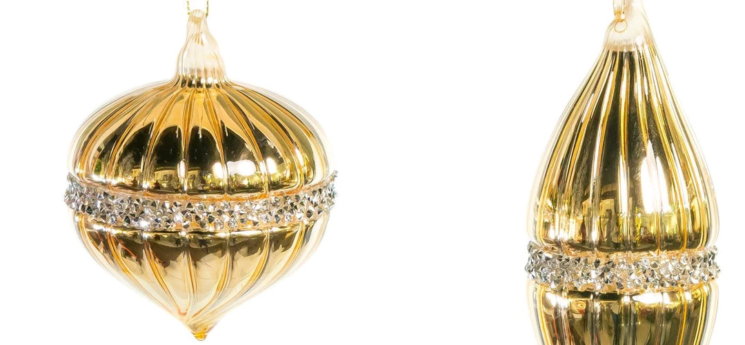 These stunning glass ornaments are a beautiful addition to your Christmas tree. Each ornament in this glass assortment is beautifully decorated with an intricate gold pattern detailed with jewels.