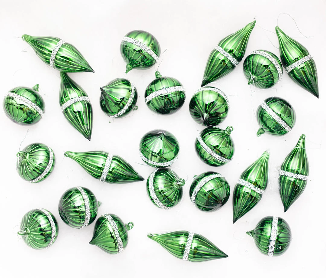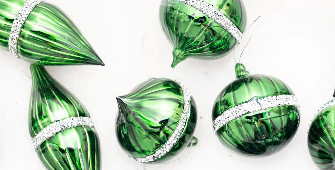 These stunning glass ornaments are a beautiful addition to your Christmas tree. Each ornament in this glass assortment is beautifully decorated with an intricate gold pattern detailed with jewels.