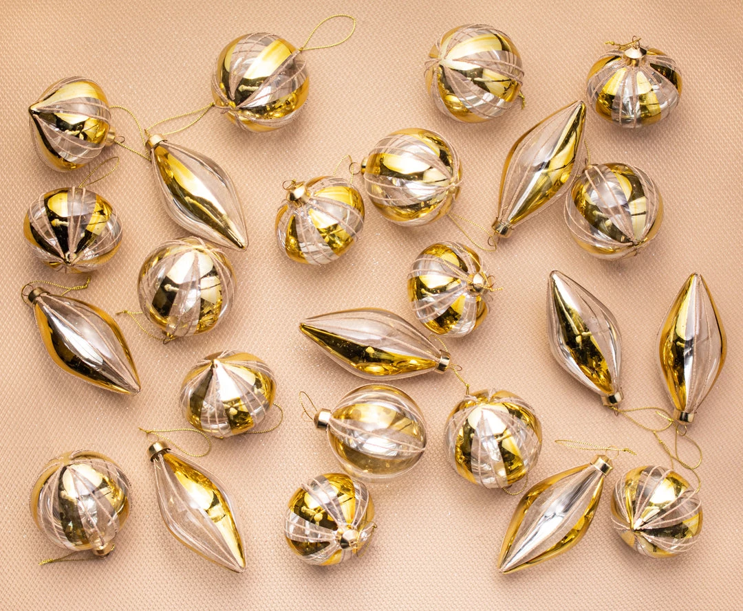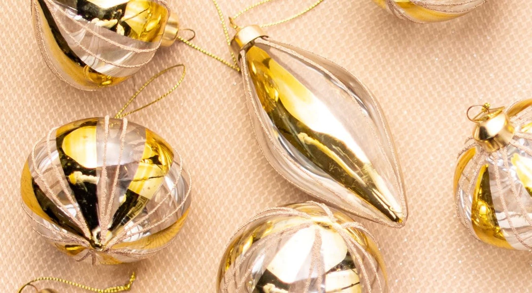 Add an elegant yet whimiscal spin to your holiday decor with these crystal clear glass ornaments sporting metallic gold designs.