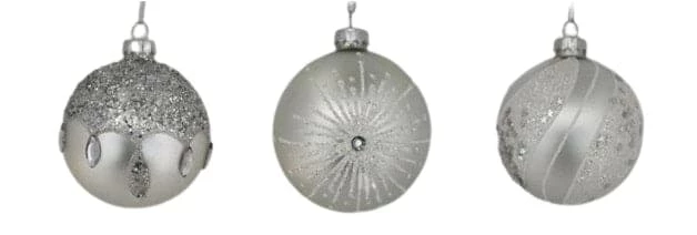 These classic matte silver ornaments are perfect with any color scheme you may have this holiday season. Each unique ornament is accented with silver glitter and jewels that will catch the eye of your guests and loved ones for many seasons.