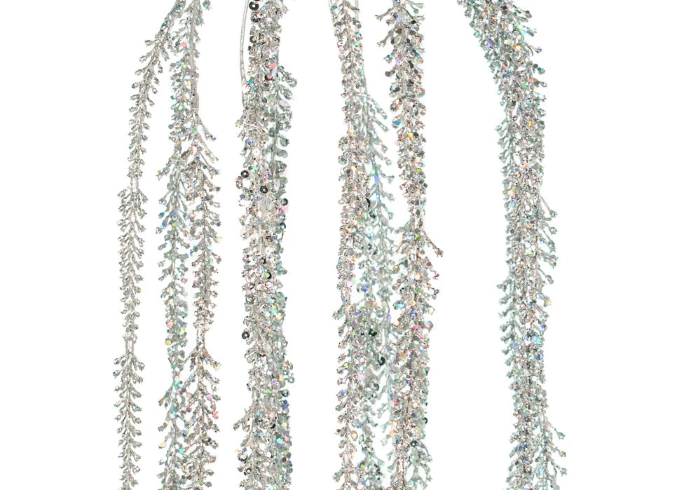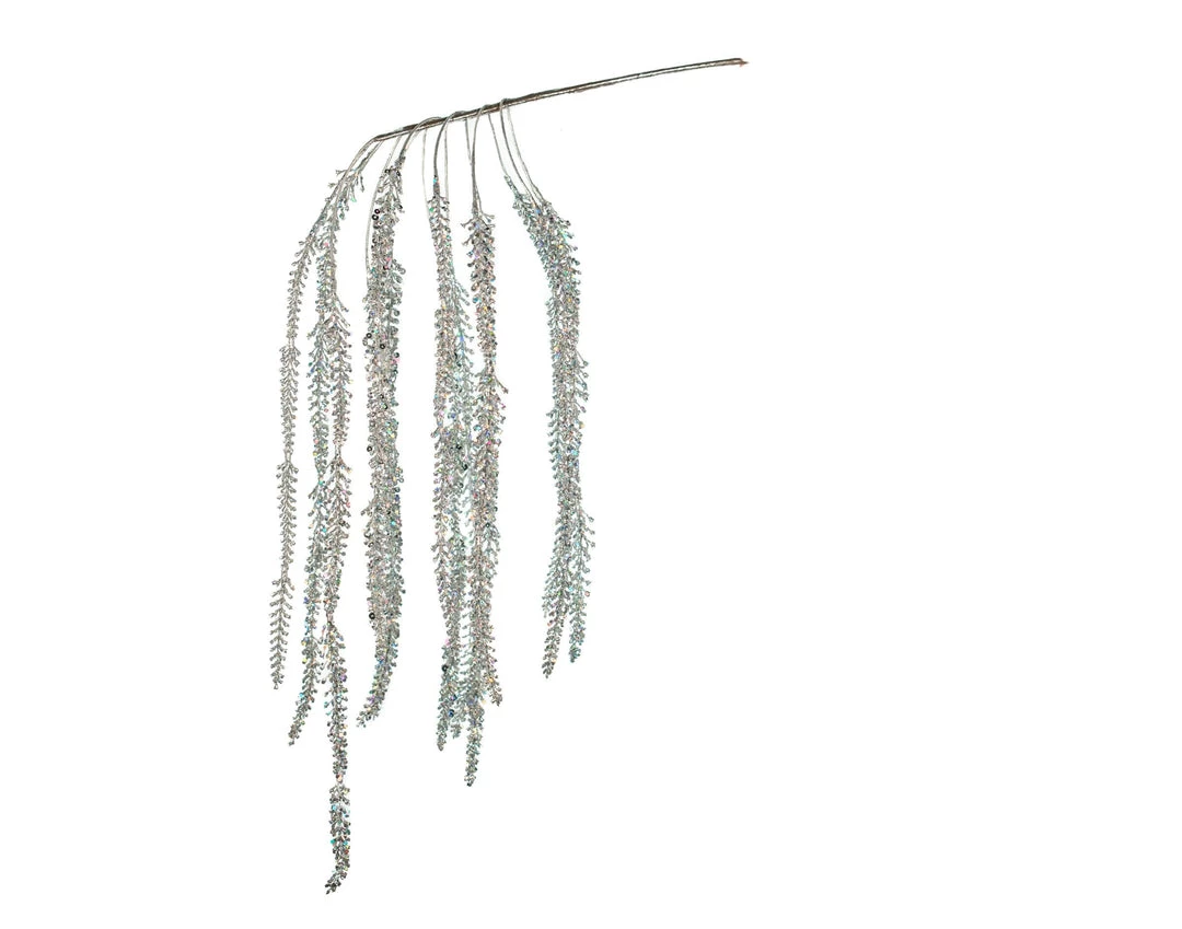 This glitter hanging branch is unique, Featuring cascading branches in clusters covered in silver glitter and sequences. Imagine how lovely this would look placed in a vase by your entry way. Buy a few sprays to create a full and plush look.