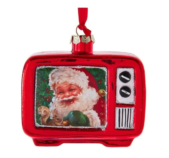 Kurt Adler’s glass Santa television ornament is a festive addition to any holiday décor or Christmas tree. It features a red and silver glittered glass television with a traditional image of Santa with a squirrel on screen.