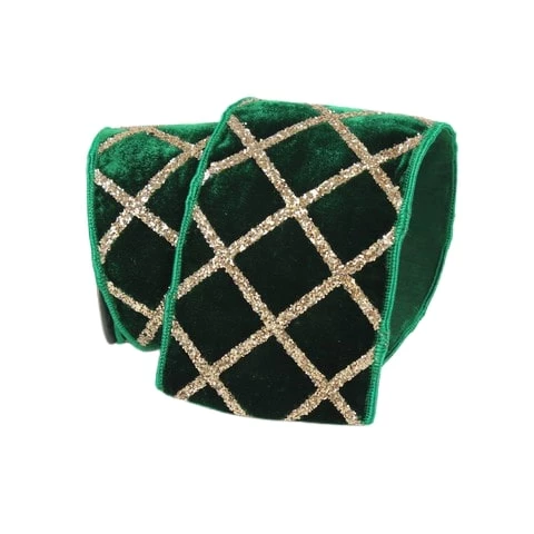 Add elegance and sophistication to your holiday decor this season. This emerald & gold velvet ribbon is a must have. It features gold glitter diamond shaped embellishments along witha velvety texture.