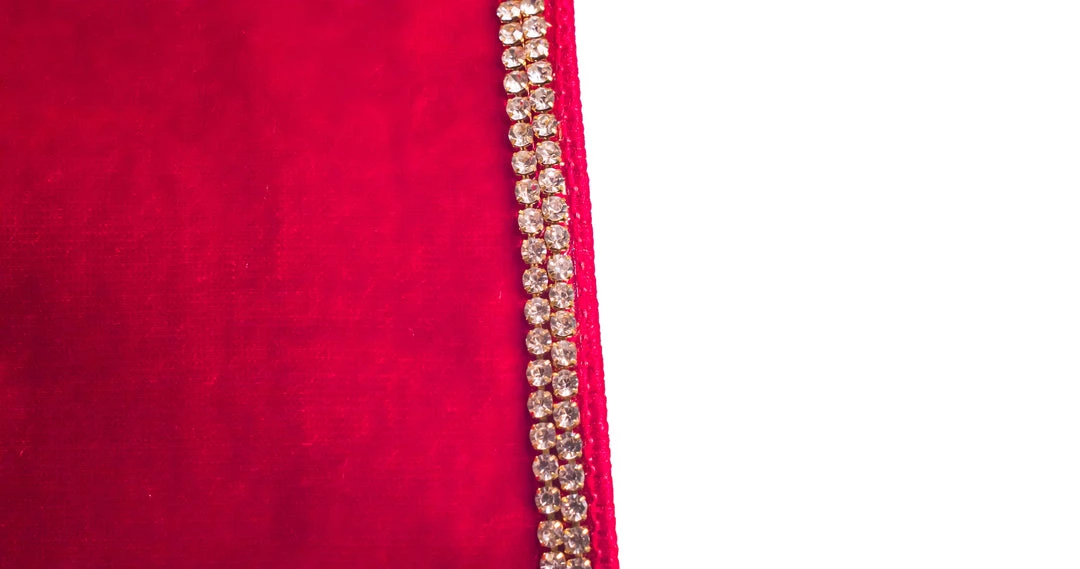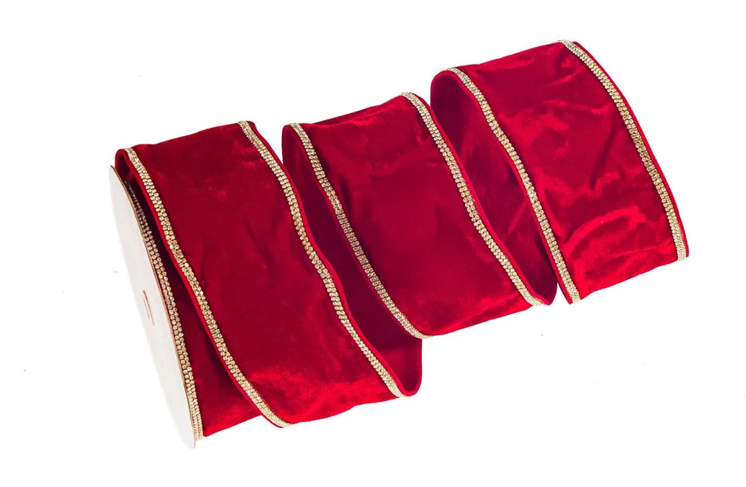 This beautiful ribbon combines luxury and tradition. It measures 4″ X 10 yds and features a wired ribbon in a rich red velvet fabric. The luxe fabric is embellished with a trim of sparkling gems set in shimmering gold, creating contrast and texture full of elegance and style. An absolutely exquisite ribbon that is sure to give your Christmas decor a touch of sophistication!