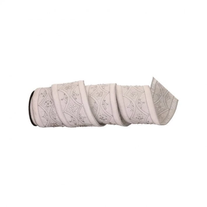 This white crisp embroidered ribbon has an upscale feel with its beautifl silver stitching, jewel accents and moldable wired lining.