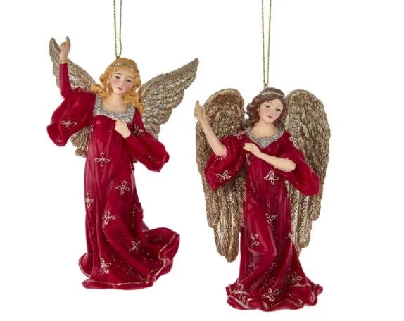 Kurt Adler’s regal red angel ornaments are a stunning addition to any holiday décor or Christmas tree. This assortment features a blonde angel wearing a regal red and gold glittered gown and a brunette angel wearing a regal red and gold glittered gown. Each angel has beautiful gold glittered wings and crown.