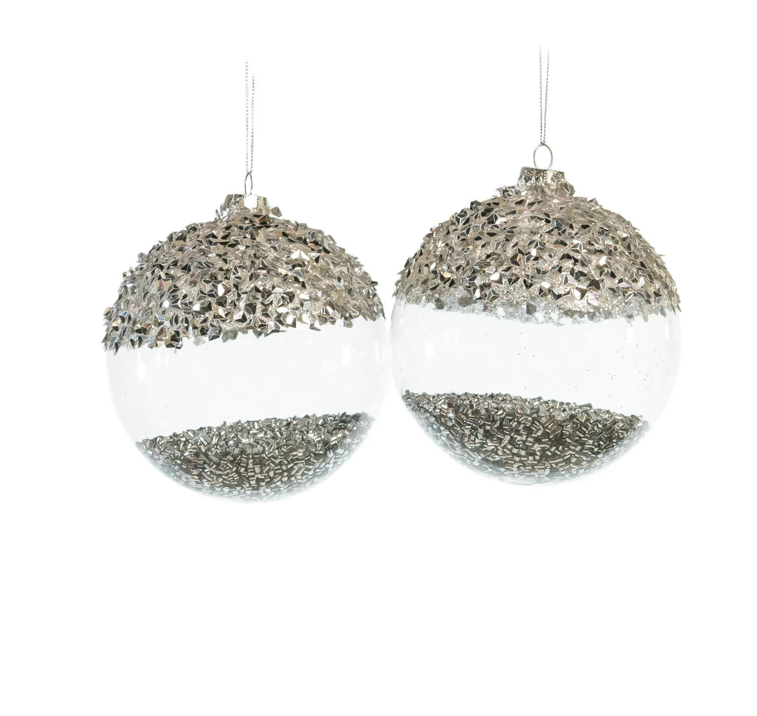 Add a unique touch to your decor this season with these clear silver sequin encrusted glass ornament. Features silver sequins on the inside aswell giving it the unique appearance. It is sure to make a statement.