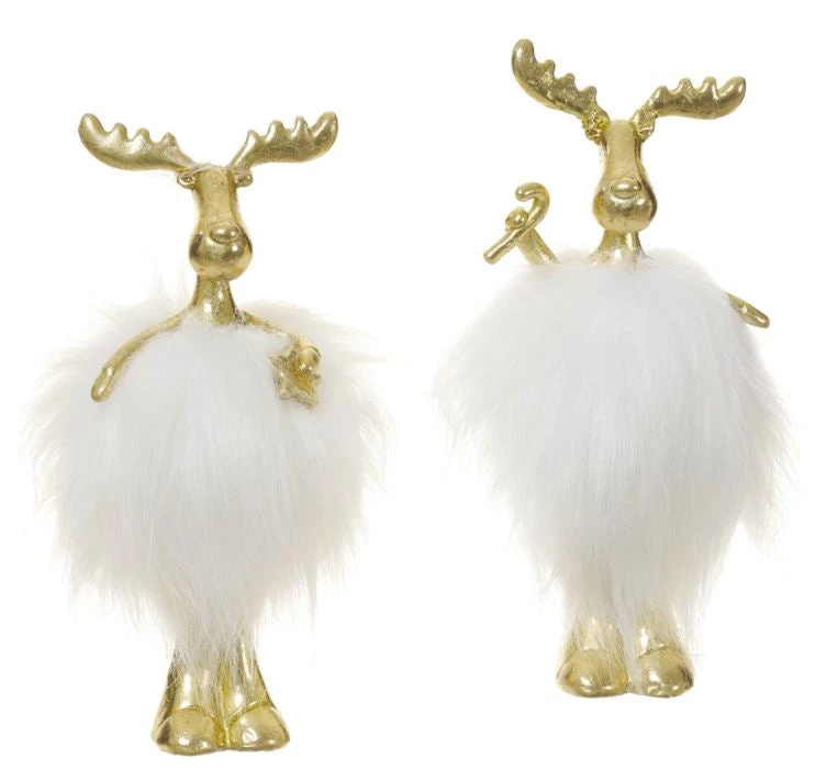 Add these elegant Moose to your holiday decor. This gorgeous gold and white table top decor is the perfect addition this holiday season. The figurine features a set of 2 moose in gold with faux fur dressing.
