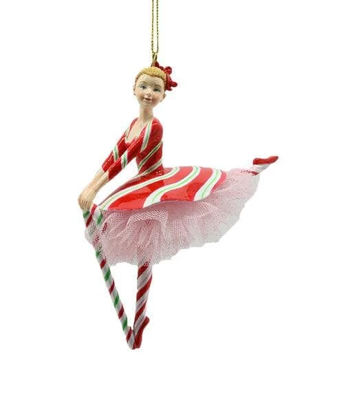 Bring the elegance of ballet to any holiday décor or Christmas tree with this peppermint candy inspired ballerina ornament. She features a red, white, & green peppermint dress and a candy cane to match.