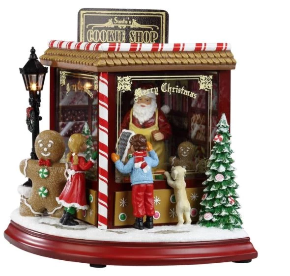A beautiful day scene depiction including the children inside the cookie shop. The excited children and the puppy have their faces in joy and also pressed up against Santa’s cookie shop window watching him make the goodies. Features cookie shop and Santa that makes the Christmas Festival in joy and happiness.