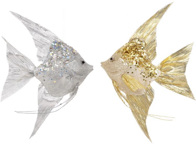 These ornaments by Mark Roberts feature a set of two under the sea favorites! These angelfish are elegantly crafted in two styles, one gold and the other silver, with shimmering metallic fins and embellished with sparkling glitter. Beautiful and glamorous, they are the perfect addition to any ocean themed holiday and will look absolutely stunning on your Christmas tree!
