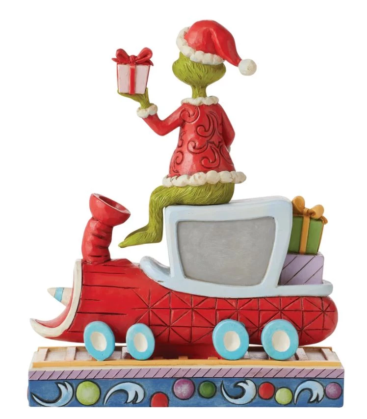 Atop a red train engine bound for Whoville, The Grinch wears a dashing red vest and Santa hat to re-deliver previously stolen presents. Finding kindness in his heart, the greedy Grinch changes his disposition and wears a smile in this Jim Shore creation.