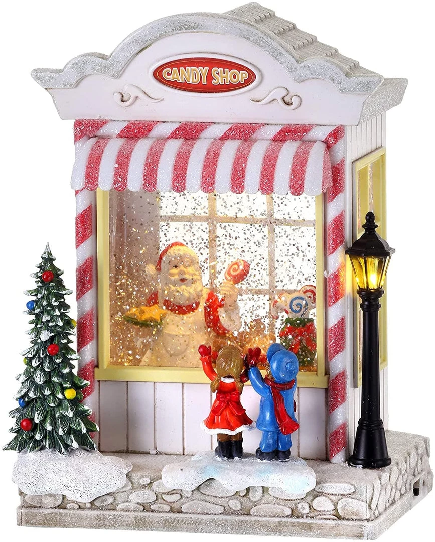 Santa Candy Shop water globe is an imaginative piece that’s perfect for tying together your holiday decor. This beautiful piece feature a candy shop in a magical water globe.