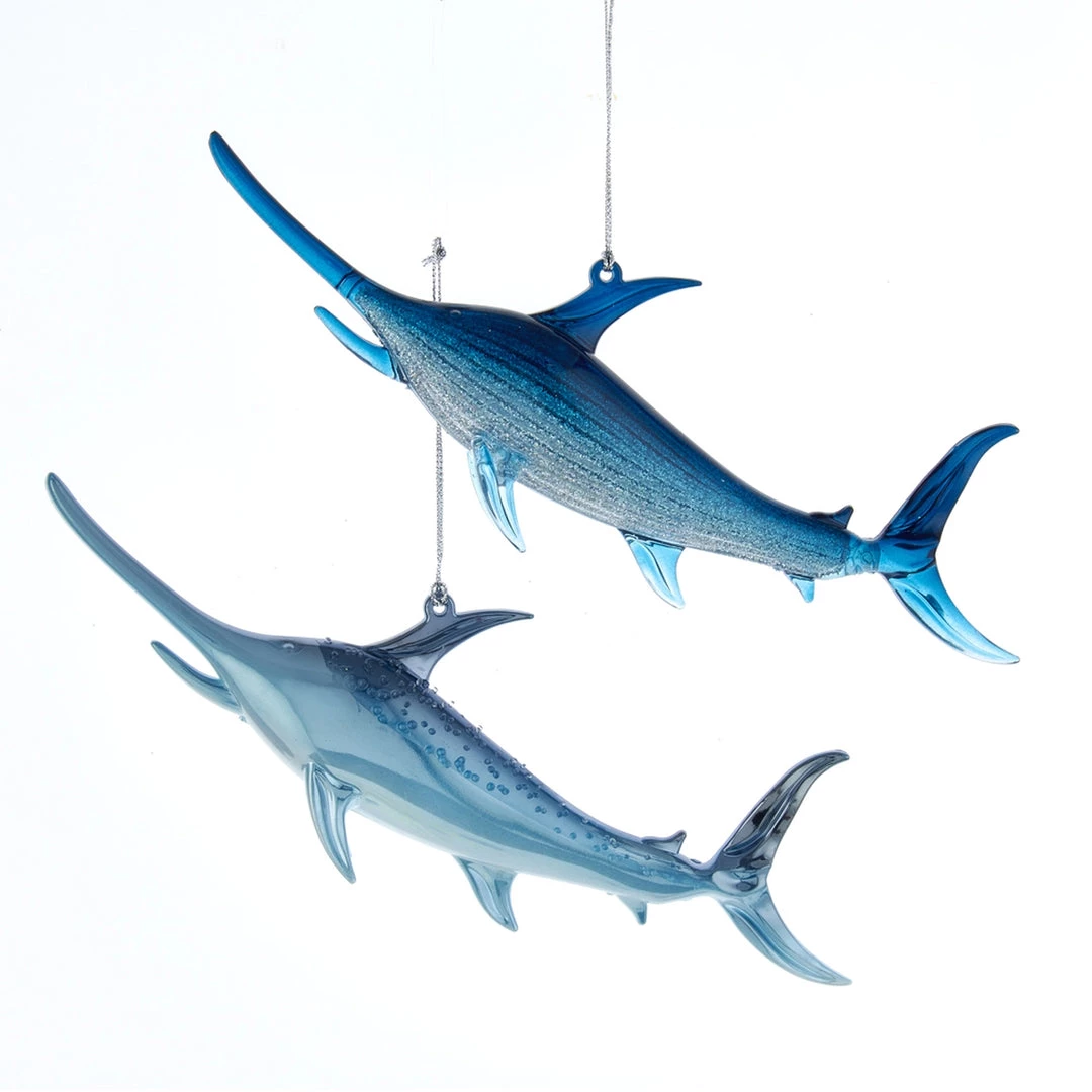 These swordfish ornaments are a unique addition to any holiday décor or Christmas tree. Included in this assortment are a light blue glittered swordfish and a dark blue glittered swordfish.