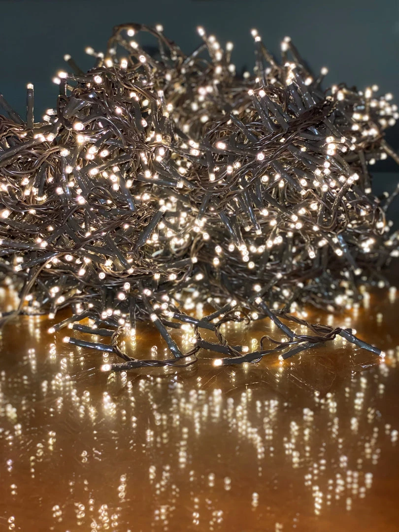 LED compact twinkle lights, warm white. 1500 lights, 111.5 feet on brown wire. One set completely decorates a 10-15 foot Christmas tree! Indoor/outdoor use. 8 functions twinkle