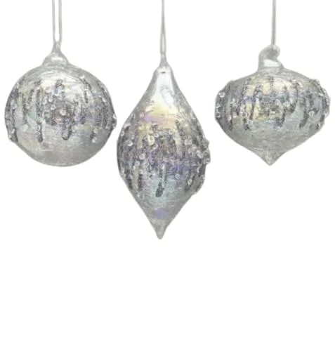 Add this unique Christmas ornament to your holiday decor. Features iridescent glass, encrusted with sparkly beads and sequins. The perfect touch of elegance to your tree.