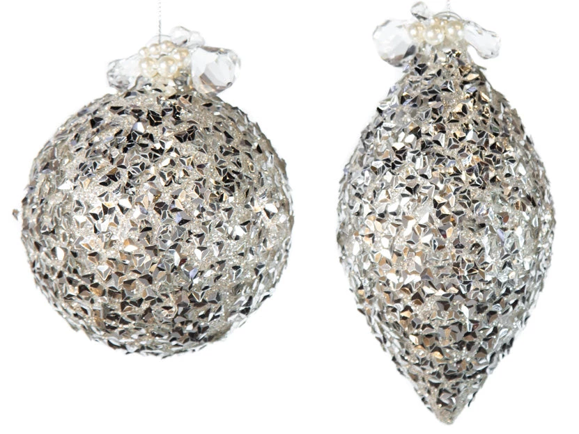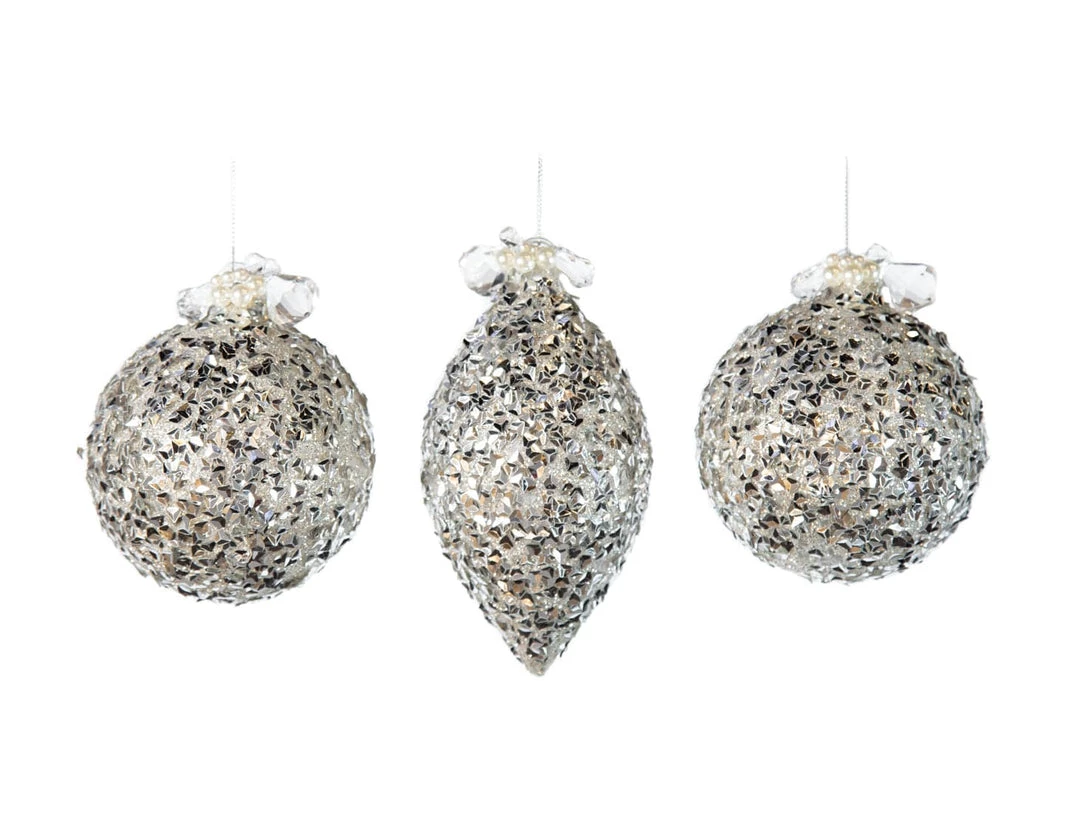 This beautiful assorted set of glass ornaments are covered in glitter that will catch light in the most delightful way all season long.