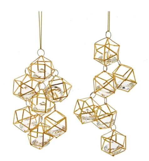 These geometric inspired gold wire drop ornaments are a stunning addition to your holiday décor or Christmas tree. This assortment includes two distinctly different gold wire drop ornaments. Each ornament has large clear gemstones in each of the wire shaped pieces that are connected by gold rings.