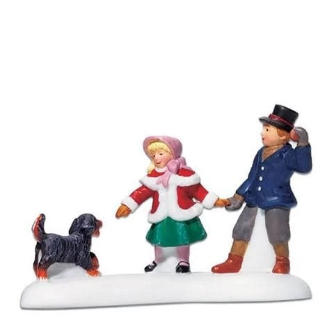 Designed to accompany Dickens Village by Department 56, these children are playing with their new Christmas puppy. Made of porcelain and hand-painted.
