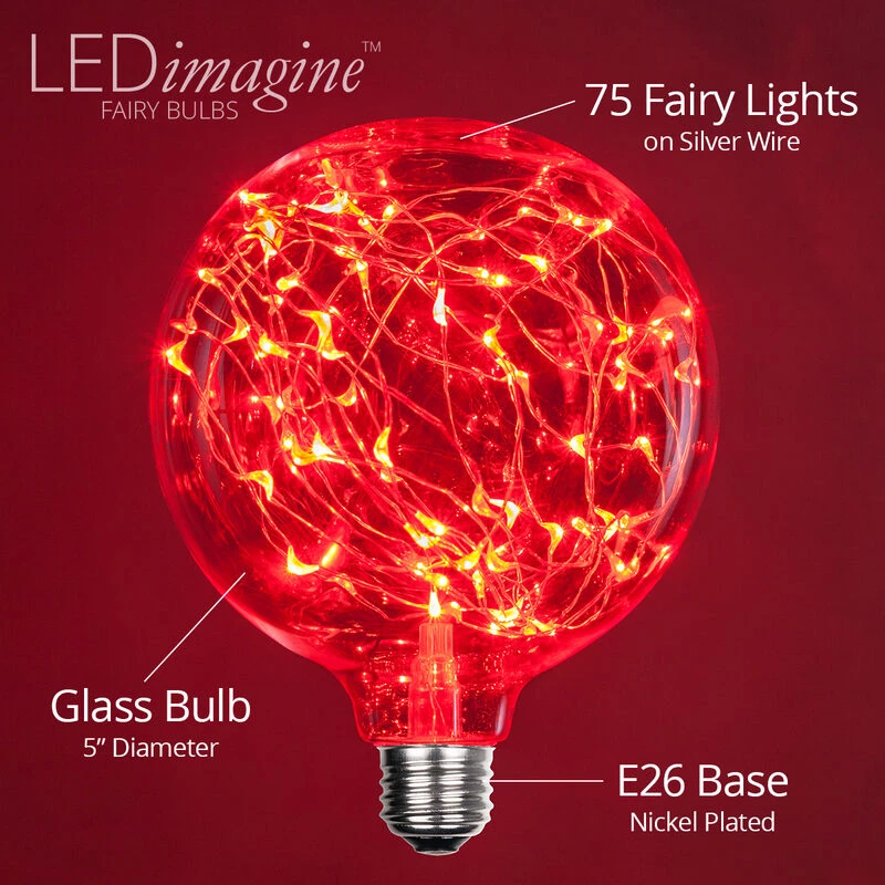 More than a bulb, the astonishing G125 LEDimagine fairy light bulb is a masterpiece of lighting design. Boasting 75 red fairy light diodes strung on silver wire inside a magnificent glass bulb, this G125 manages to be breathtaking and subtle at the same time. Bold enough to serve as a centerpiece or standalone decoration, it can also be combined with other colors and sizes of LEDimagine fairy light bulbs to form a huge array of creative lit displays. Imagine the possibilities with LEDimagine fairy light bulbs.