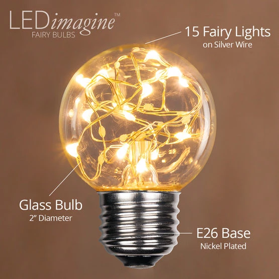 G50 clear glass bulb with 15 warm white fairy lights on silver wire strung inside; E26 base