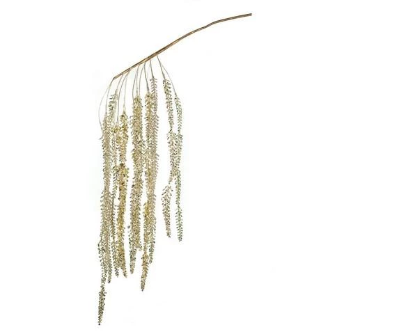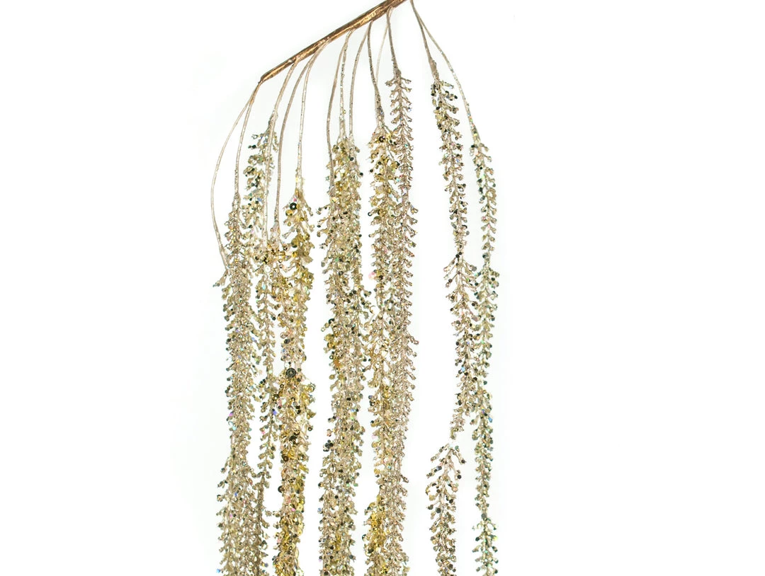 This glitter hanging branch is unique, Featuring cascading branches in clusters covered in champagne glitter and sequences. Imagine how lovely this would look placed in a vase by your entry way. Buy a few sprays to create a full and plush look.