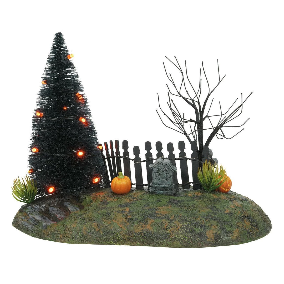 This vignette accessory has all the makings of a frightful scene — a black sisal with orange LED lights, a rickety black fence, spooky bare tree, pumpkins and a gravestone. Perfect near the cemetery or in the front yard.