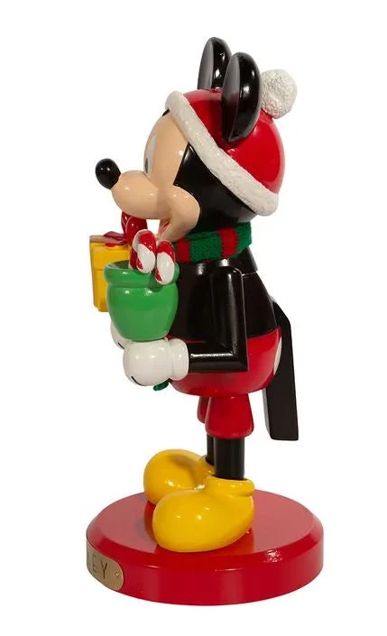 The Disney© Mickey Mouse with present nutcracker red bow and a red and white peppermint candy cane. On a gold plaque, “Mickey Mouse” is written at the front of the wooden base.