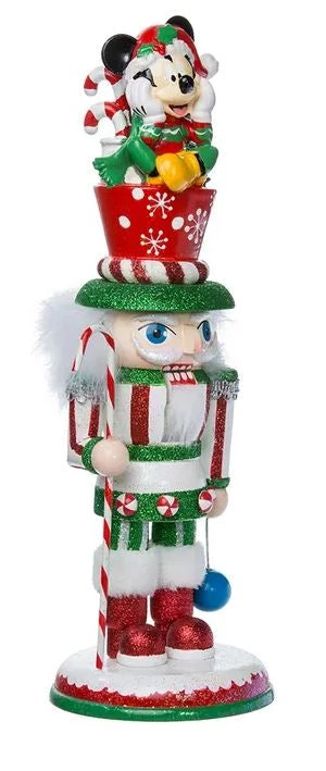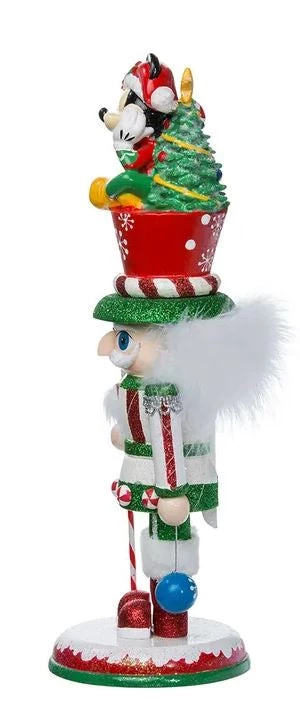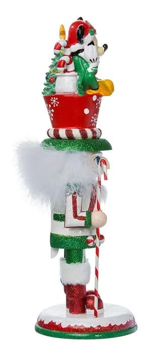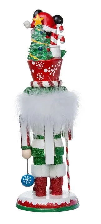 Attention Disney lovers! This whimsical Nutcracker figure combines classic Christmas style with Disney charm. He is smartly dressed in traditional Christmas colors of red, white, and green. His uniform features a glitter candy stripe jacket and pants adorned with peppermints. His red glitter boots have white faux fur accents that compliment his candy cane staff. In his other hand, he is holding a blue ornament with a snowflake design adding a pop of color. Perched on top of the nutcrackers red, white, and green hat is none other than Mickey Mouse! Wearing a Santa hat and holiday sweater, Mickey is sitting comfortably in front of a Christmas tree. This adorable nutcracker would be a great addition to your nutcracker collection and coordinates perfectly with our Minnie Mouse nutcracker!