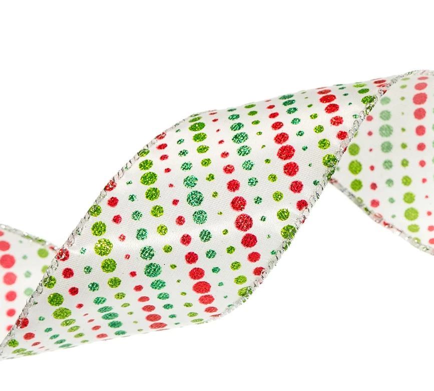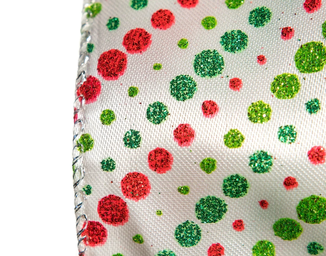 These colorful glitter ribbons are great when you want to add sparkle to your gifts or christmas decor. Ribbons feature various sized dots made of glitter in a few complementary colors on one side of sheer ribbon. These ribbons are also wired so you can create beautiful voluminous designs.