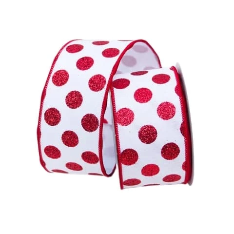 Add a whimsical touch to your packaging and decor with this sparkly red dot ribbon. This ribbon is 4″ wide and crisp to the touch. It features a classic polka dot pattern emphasized by glitter on top of a lightweight, white fabric. Ribbon is constructed with thick, wired edge and is fused with a secondary fabric to provide shape and structure.
