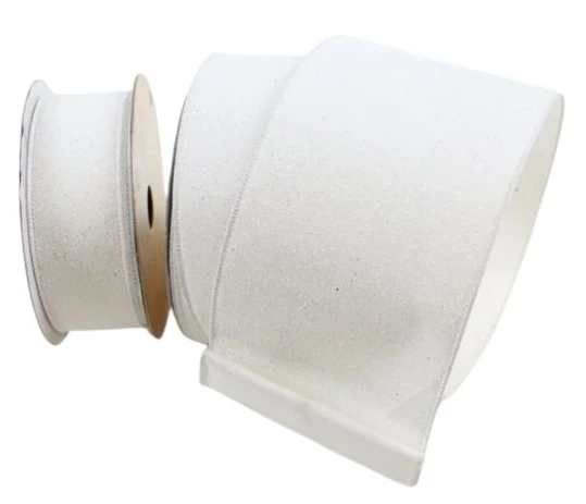 Simple yet elegant, this wired ribbon features fabric in a pristine white color encrusted with sparkling glitter is what is in this Christmas. Sewn wire edged ribbon allows you to bend and shape your creations to decorate with ease, making it perfect for decorating Christmas trees, wreaths, or gift accenting. Made in true designer quality, and crafted from the finest materials, this gorgeous ribbon is sure to bring luxury and elegance to your holiday decor!